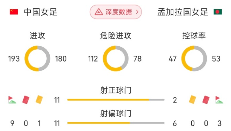 关键就是孟加拉国女足的前锋和中场在防守端掐断了中国女足的中场推进,哪怕是王霜在对方中场线和后卫线之间的夹层拿球,也很容易被对方补防球员缠上。